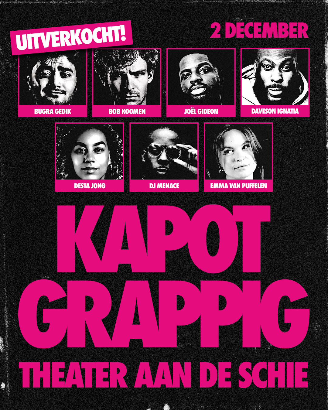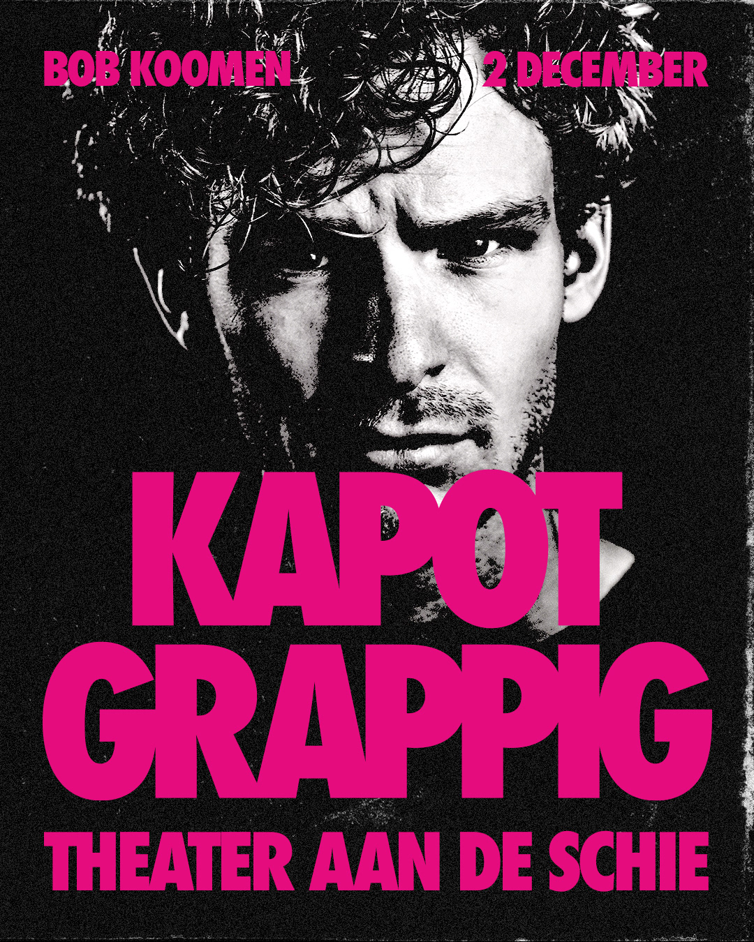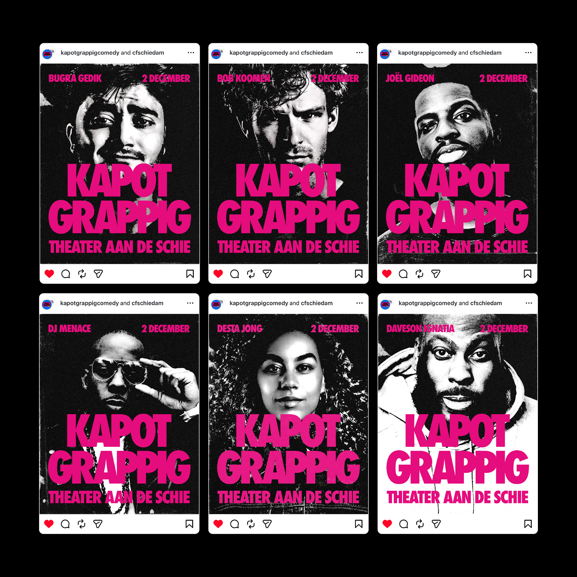 The third edition of Kapot Grappig marked the first anniversary. After two successful editions, expectations were high: the series had to move forward without becoming a repetition. The campaign builds on the existing visual system, same rhythm, same logic, but darker and sharper. The only color is a bold magenta. All photography is black and white with extreme contrast, causing the black areas to fully dissolve into the background. What remains are faces, details, moments, stripped of context and razor sharp. The visual language draws inspiration from threshold effects and the aesthetic of old copy machines. It carries a worn quality, something that has passed through the machine before, fitting for an edition that builds on what came before. The act of copying is part of the concept. This campaign was built with a strong focus on online, meeting the audience where they are. It includes individual Instagram posts for each act, a group post featuring the full lineup, a sold-out announcement and a printed flyer with the timeline. The sold-out post is a moment of its own, closing the ticket sales while celebrating the success of the edition.