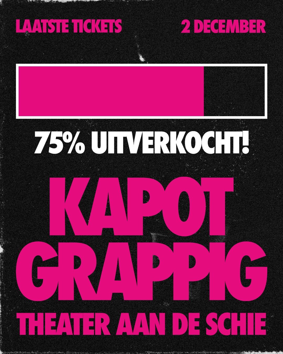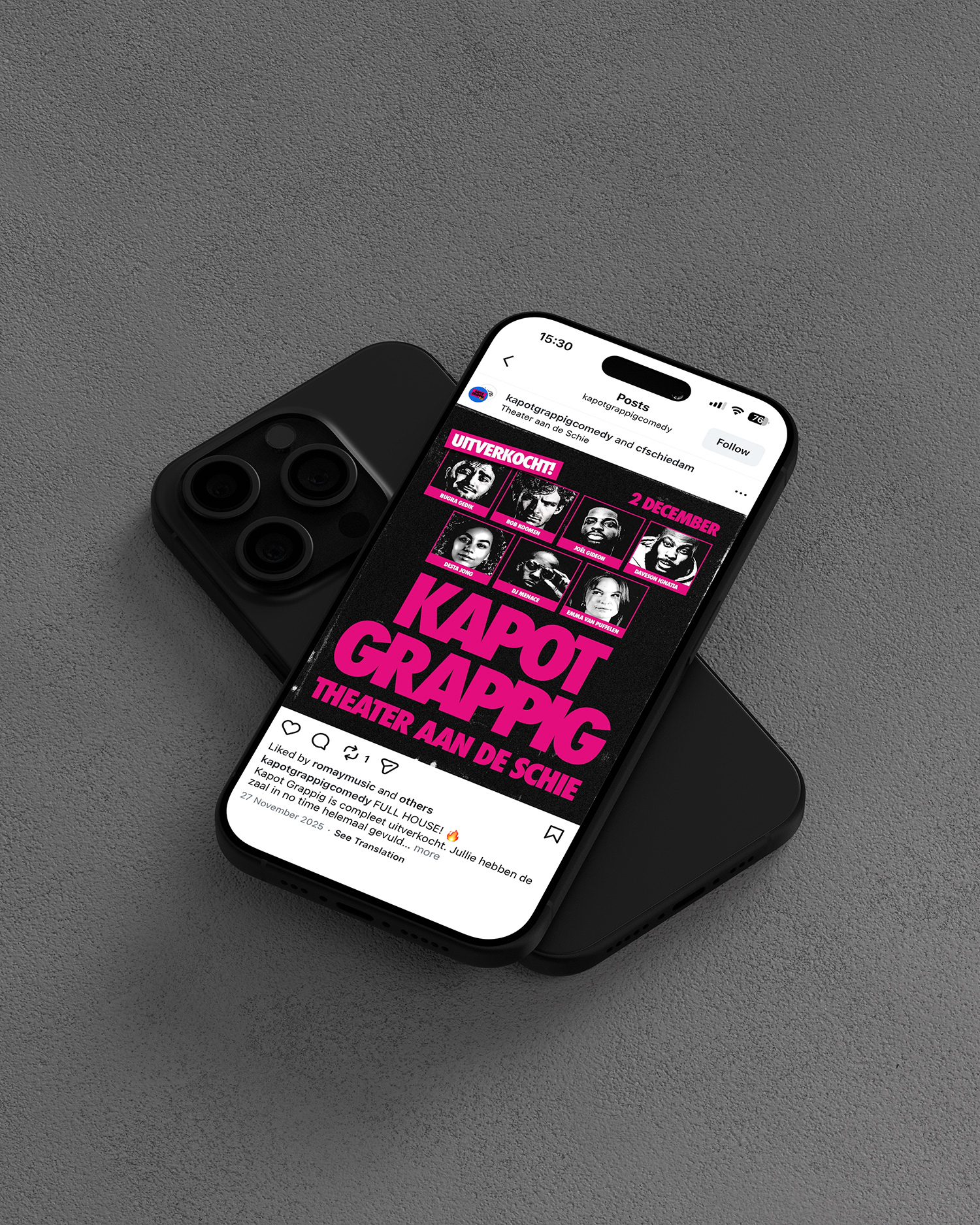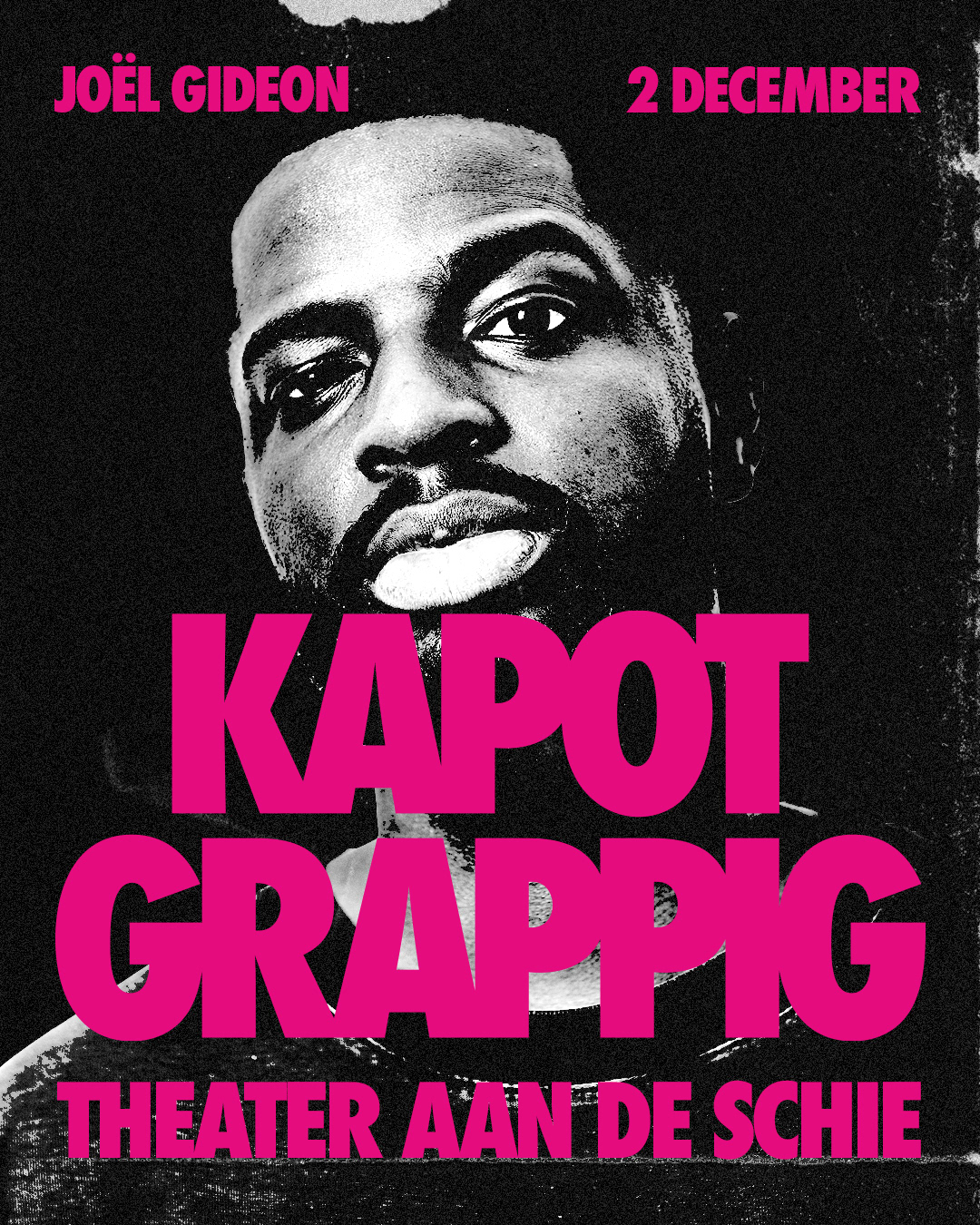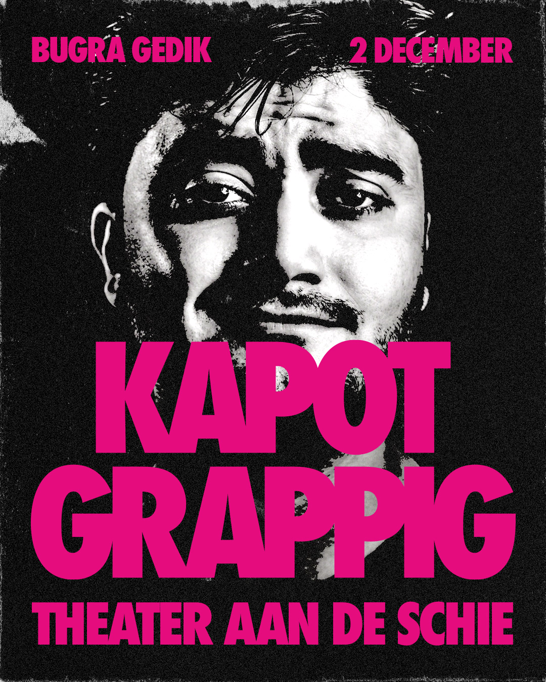 The third edition of Kapot Grappig marked the first anniversary. After two successful editions, expectations were high: the series had to move forward without becoming a repetition. The campaign builds on the existing visual system, same rhythm, same logic, but darker and sharper. The only color is a bold magenta. All photography is black and white with extreme contrast, causing the black areas to fully dissolve into the background. What remains are faces, details, moments, stripped of context and razor sharp. The visual language draws inspiration from threshold effects and the aesthetic of old copy machines. It carries a worn quality, something that has passed through the machine before, fitting for an edition that builds on what came before. The act of copying is part of the concept. This campaign was built with a strong focus on online, meeting the audience where they are. It includes individual Instagram posts for each act, a group post featuring the full lineup, a sold-out announcement and a printed flyer with the timeline. The sold-out post is a moment of its own, closing the ticket sales while celebrating the success of the edition.